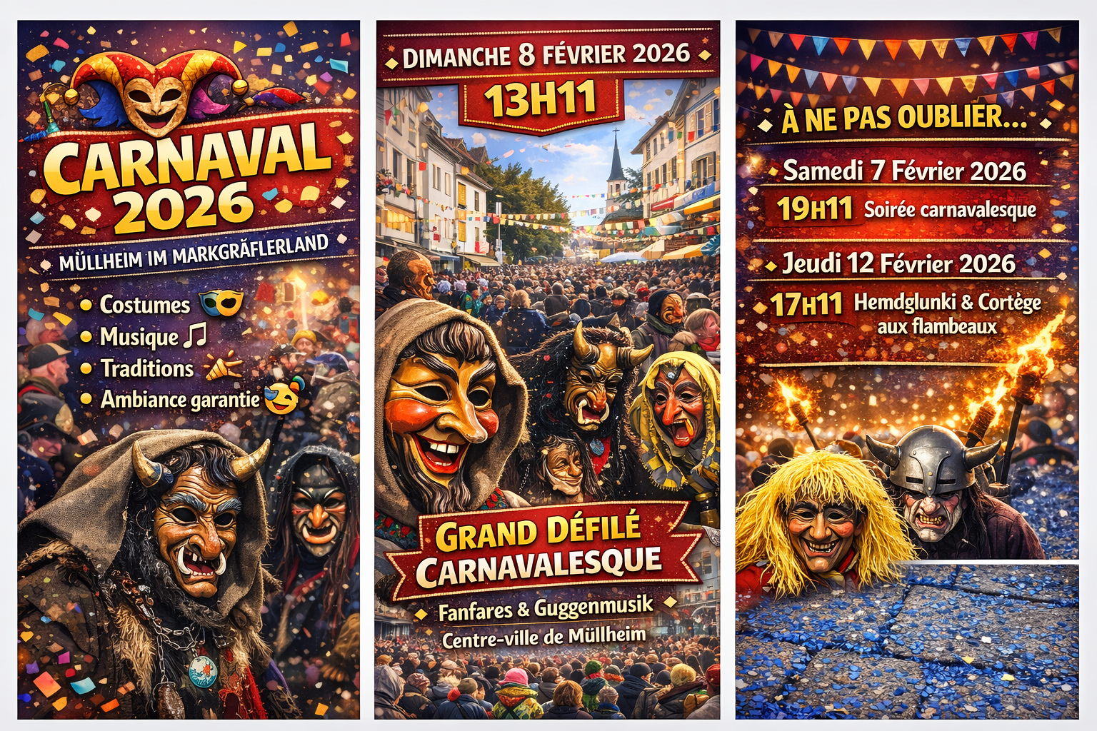 🎭🎉 Carnaval 2026 à Müllheim im Markgräflerland 🎉🎭 📅 Samedi 7 février 2026 🕖 dès 19h11 – Soirée carnavalesque (Zunftabend) 📅 Dimanche 8 février 2026 🕐 13h11 – 🎊 Grand défilé carnavalesque dans le centre-ville 📅 Jeudi 12 février 2026 🕯️ 17h11 – Hemdglunki & cortège aux flambeaux Costumes, musique, traditions et ambiance garantie 🥳 👉 Sortez vos déguisements et venez faire la fête à Müllheim ! Narri-Narro ! 🎭🎉 Rendz vous sur notre page spéciale carnaval !