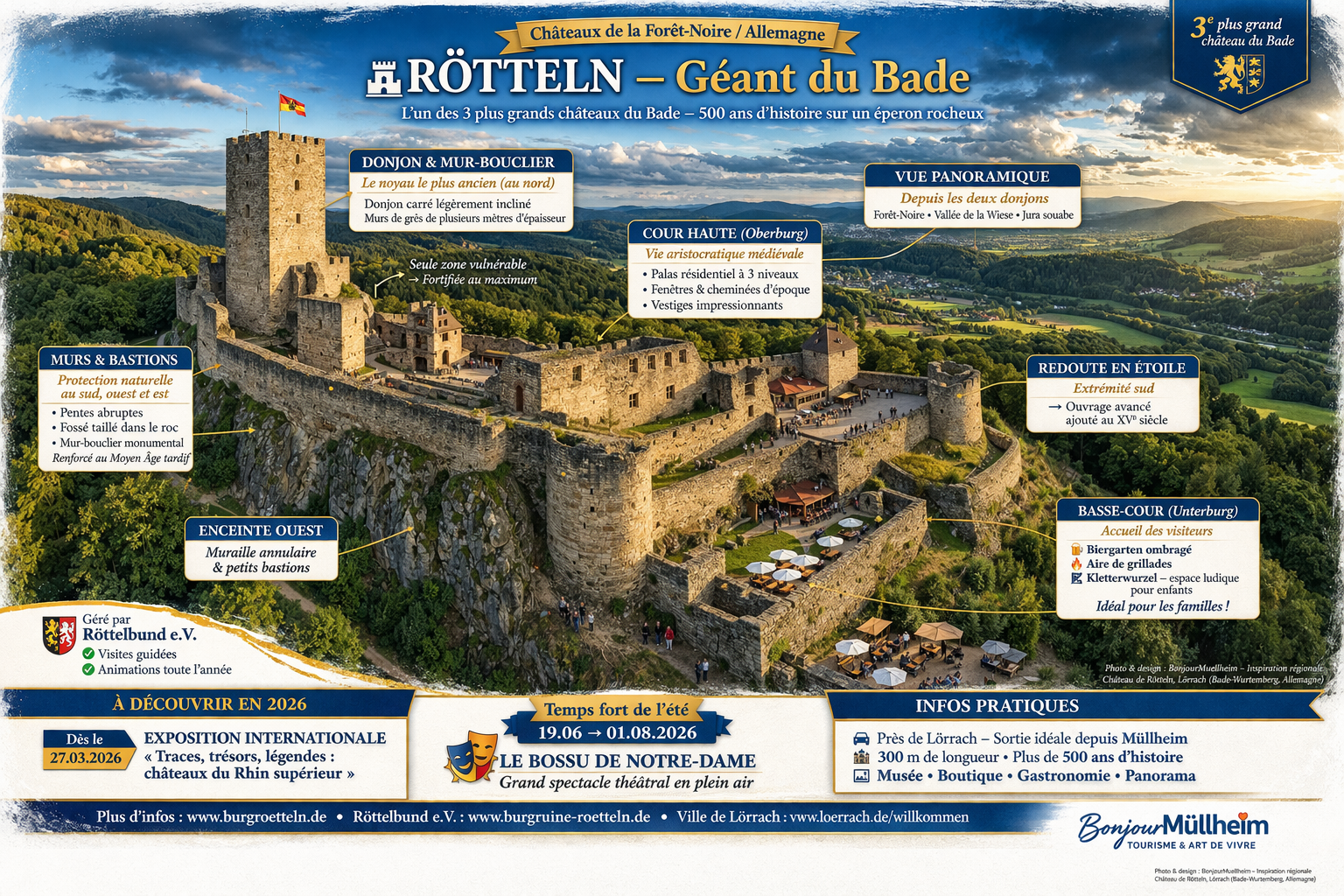 Dominant majestueusement les paysages du sud du Bade-Wurtemberg, la forteresse de Rötteln s’impose comme l’un des témoins les plus spectaculaires de l’histoire médiévale du Rhin supérieur. Située à proximité de Lörrach, à la lisière de la Forêt-Noire, elle constitue aujourd’hui l’un des ensembles castraux les plus vastes et les mieux conservés de la région. Édifiée et transformée sur plus de cinq siècles, la forteresse reflète les évolutions politiques et militaires du territoire badois. Trois lignées successives – les seigneurs de Rötteln, les margraves de Hachberg-Sausenberg, puis ceux de Baden-Durlach – ont façonné cet édifice monumental, étendu sur près de 300 mètres le long d’une crête. L’architecture défensive du site témoigne d’une remarquable adaptation au relief. Protégée naturellement par des pentes abruptes sur trois côtés, la forteresse concentrait ses dispositifs de défense au nord, seule zone vulnérable. Les puissants murs-boucliers et les bastions ajoutés à la fin du Moyen Âge illustrent l’évolution des techniques militaires face aux nouvelles menaces. Au-delà de son rôle stratégique, Rötteln fut également un lieu de vie aristocratique. Les vestiges du palais résidentiel et les éléments architecturaux conservés témoignent d’un certain raffinement, révélant le statut et le confort de ses occupants. Aujourd’hui, la forteresse s’inscrit pleinement dans une dynamique de valorisation patrimoniale. Le site propose une expérience immersive mêlant histoire, culture et loisirs : panorama exceptionnel, musée, gastronomie et événements culturels rythment la vie du lieu. L’année 2026 s’annonce particulièrement riche, avec l’exposition internationale « Châteaux rhénans » et les traditionnelles représentations théâtrales estivales, dont Le Bossu de Notre-Dame. Ces initiatives confirment le rôle central de Rötteln dans la mise en valeur du patrimoine du Rhin supérieur.